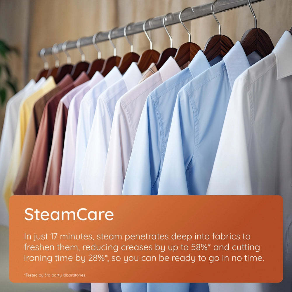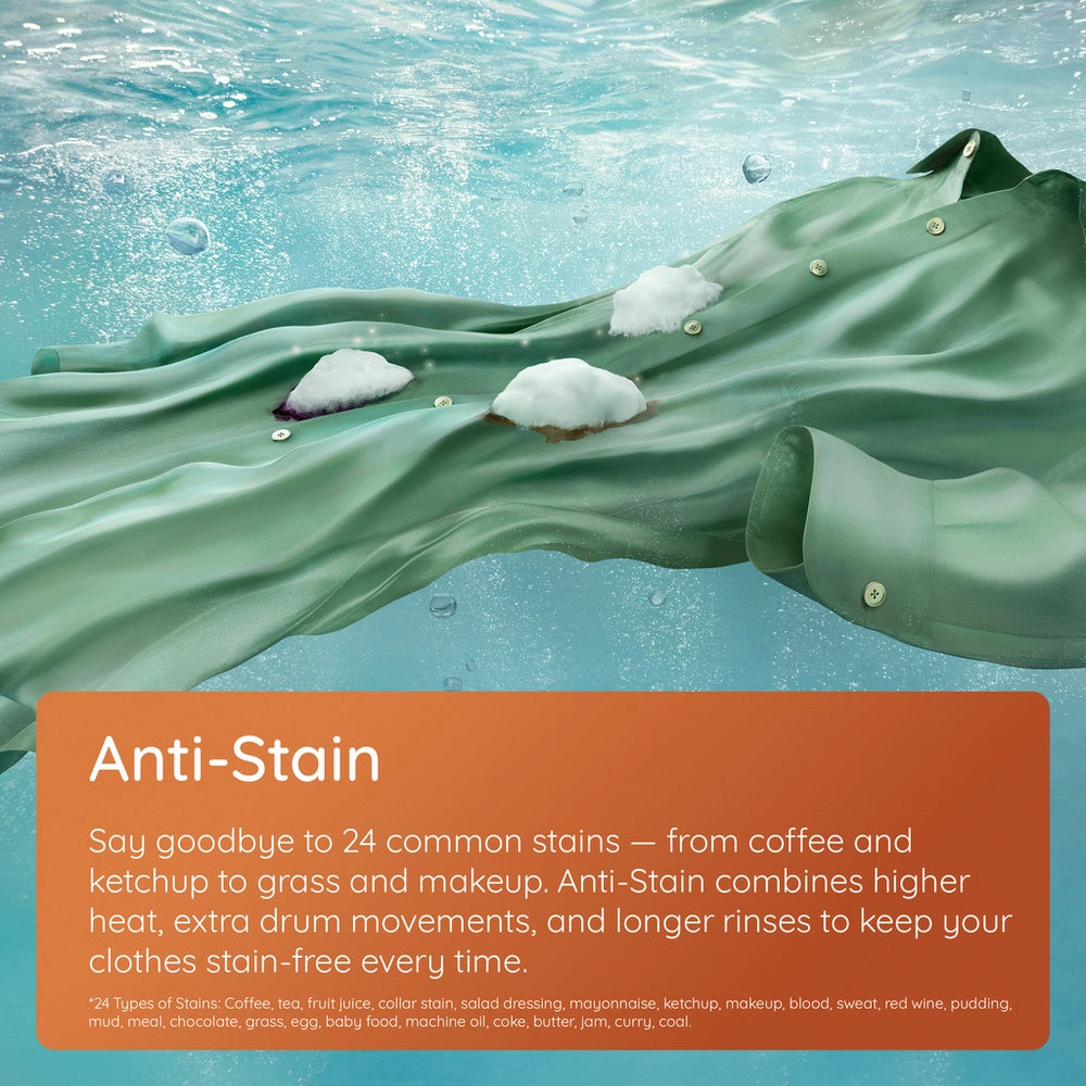 Choose from a variety of tailored washing programmes including Eco 40-60, Cotton + Steam, Synthetics + Steam, Anti-Stain, and a quick 14/28-minute wash option to fit your various laundry needs. The Full Load 45’ programme ensures powerful cleaning in under an hour, while the SteamCare function refreshes lightly worn clothes and reduces creases in just 17 minutes.